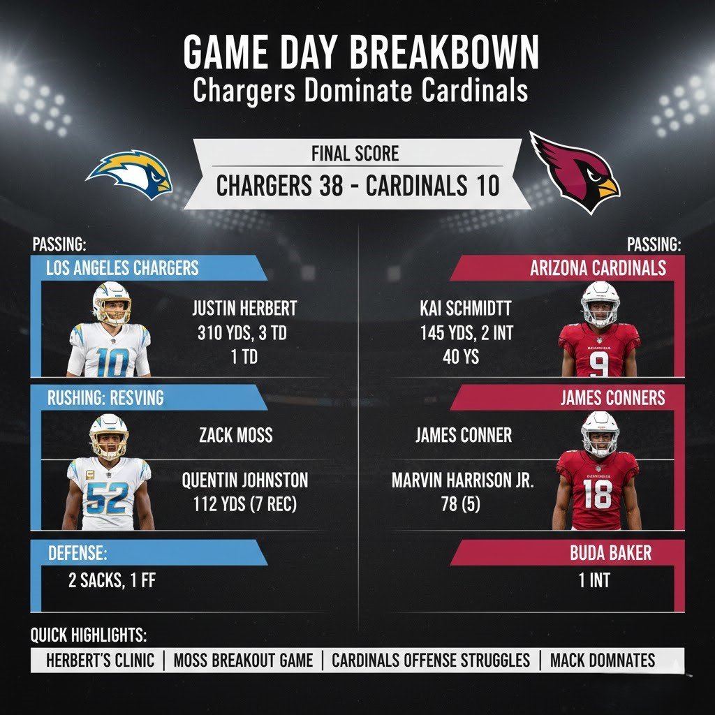 This was a tale of two philosophies. According to the chargers vs arizona cardinals match player stats, the Chargers struggled to generate push for J.K. Dobbins, finishing with only 59 team rushing yards. Conversely, James Conner acted as a human battering ram, recording his third 100-yard game of the season.