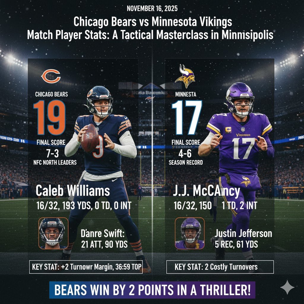 The 19–17 victory for the Chicago Bears serves as a “statement of identity.” They aren’t the most explosive team in the NFL, but they are arguably the most disciplined. By winning the battle of Time of Possession (37 minutes to 23) and the Turnover Battle (2 to 0), they successfully neutralized a high-powered Vikings offense in a hostile environment.