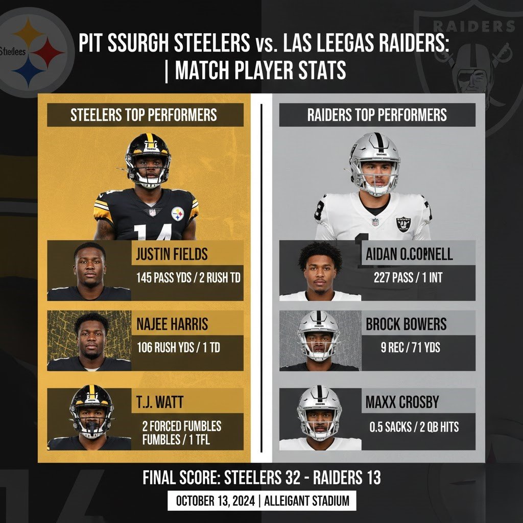 In their most recent high-stakes encounter on October 13, 2024, the Steelers traveled to Las Vegas and delivered a statement 32–13 victory. This article provides an exhaustive breakdown of the player statistics, historical context, advanced analytics, and tactical nuances that define this AFC classic, offering insights for both die-hard fans and savvy bettors.